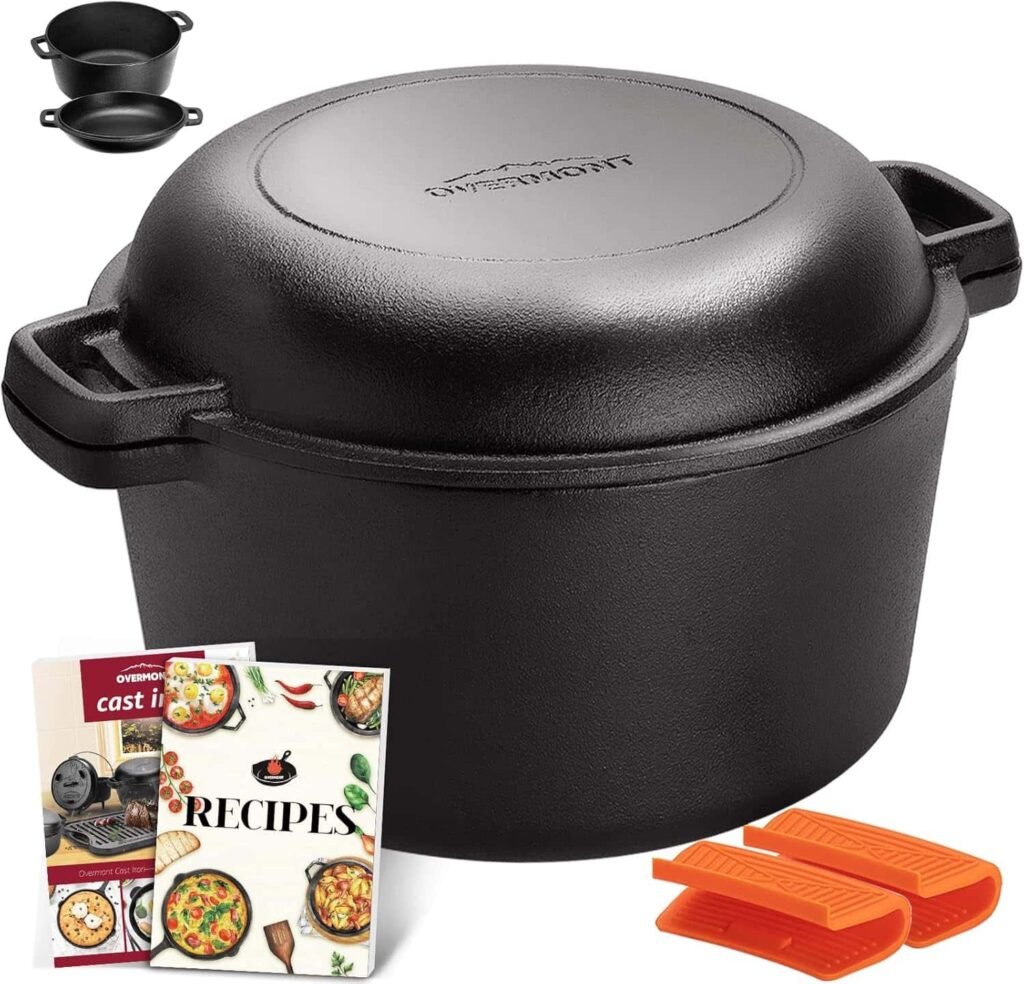 The Overmont 2-in-1 Cast Iron Dutch Oven is a versatile and budget-friendly option that delivers impressive performance for both indoor and outdoor cooking. Designed with practicality in mind, this Dutch oven features a clever 2-in-1 design where the lid doubles as a skillet, giving you added flexibility for frying, searing, or baking.