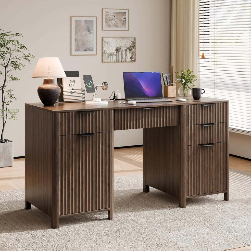 The Herihome 58″ Fluted Home Office Desk brings executive elegance and everyday functionality together for a workspace that looks as professional as it performs. Its distinctive fluted panel design adds depth and luxury, making it a statement piece in home offices, studios, and corporate rooms. The spacious 58-inch desktop easily holds monitors, laptops, documents, and décor while keeping your workflow smooth and uncluttered. Built from high-quality engineered wood with a solid, supportive base, this desk offers excellent stability and long-term durability. The smooth, water-resistant surface resists scratches and wipes clean in seconds, ideal for busy professionals. Generous legroom promotes comfort during long working hours, while the balanced proportions prevent the desk from overwhelming your space. Assembly is simple with clearly labeled parts and straightforward instructions. Whether you are managing meetings, creating content, or handling daily business tasks, the Herihome Fluted Desk delivers refined style, reliable strength, and a confidence-boosting executive presence that elevates productivity and transforms any office into a polished, modern command center. It supports focused work, organized storage, and long-term professional growth.