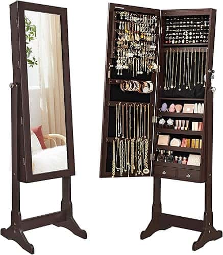 Elegant and functional, the Best Choice Products Freestanding Jewelry Armoire is perfect for organizing your jewelry collection in style. This tall, mirrored cabinet features ample storage with multiple drawers, hooks, and compartments to neatly arrange necklaces, earrings, rings, and bracelets. The full-length mirror makes it easy to check your outfit from head to toe, while the sturdy, freestanding design ensures stability. Its soft velvet lining protects delicate jewelry from scratches, and the lockable door keeps valuables secure. With its chic finish and classic design, it complements any bedroom or dressing area beautifully. If you’re seeking a space-saving, all-in-one solution for jewelry storage, this armoire delivers both elegance and practicality. It’s ideal for fashion enthusiasts who love to keep their accessories organized and within easy reach every day.