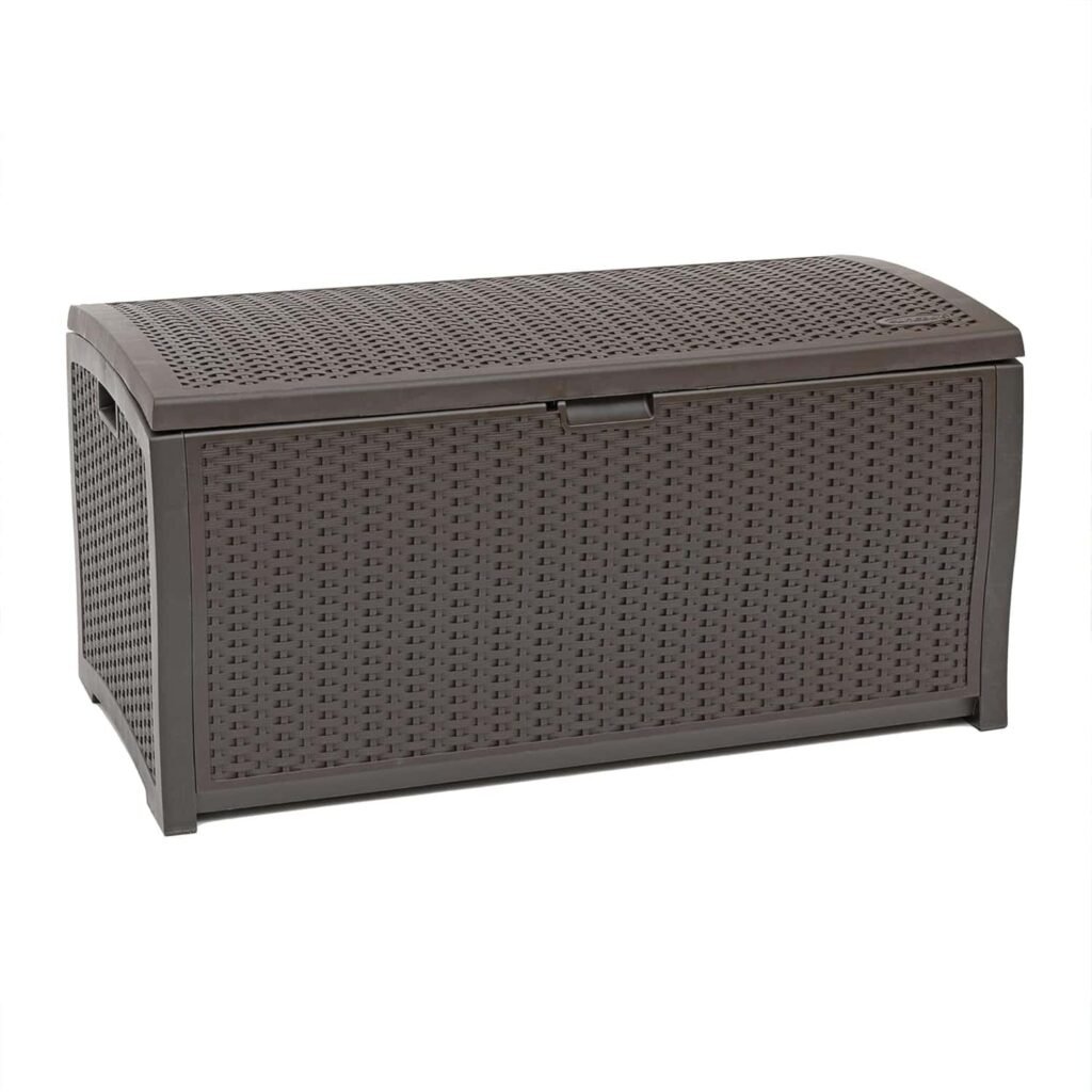 8. Suncast DBW7300 Mocha Wicker Resin Deck Box, 73-Gallon
