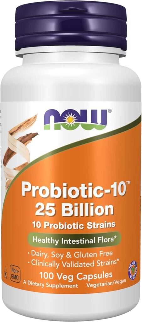 NOW Probiotic-10 25 Billion offers comprehensive digestive and immune support with ten beneficial probiotic strains. Each vegetarian capsule delivers 25 billion CFUs to help maintain a balanced gut microbiome, enhance nutrient absorption, and support natural immunity. The combination of Lactobacillus and Bifidobacterium species ensures full-spectrum digestive health, from the small intestine to the colon. This non-GMO supplement is free from dairy, soy, and gluten, making it suitable for most dietary needs. NOW Foods is known for purity and scientific formulation, ensuring every batch is quality tested for potency and safety. Regular use may reduce occasional bloating, gas, and digestive discomfort while promoting smoother digestion and better regularity. Shelf-stable and easy to take daily, NOW Probiotic-10 supports long-term gut wellness and overall vitality. For a clean, reliable, and balanced probiotic supplement, NOW’s Probiotic-10 is a great choice for everyday digestive health.