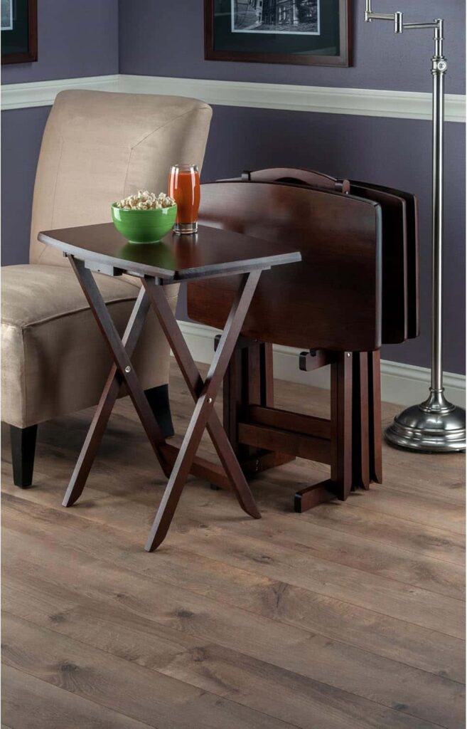 The Winsome Wood 5-Piece TV Table Set is an excellent choice for busy households, families, or anyone who loves convenience paired with classic style. This set includes four spacious snack tables and a matching storage stand, making it easy to serve meals, snacks, or drinks during gatherings, movie nights, or everyday living. Each table offers a wide, stable surface ideal for laptops, crafting, or breakfast in front of the TV.