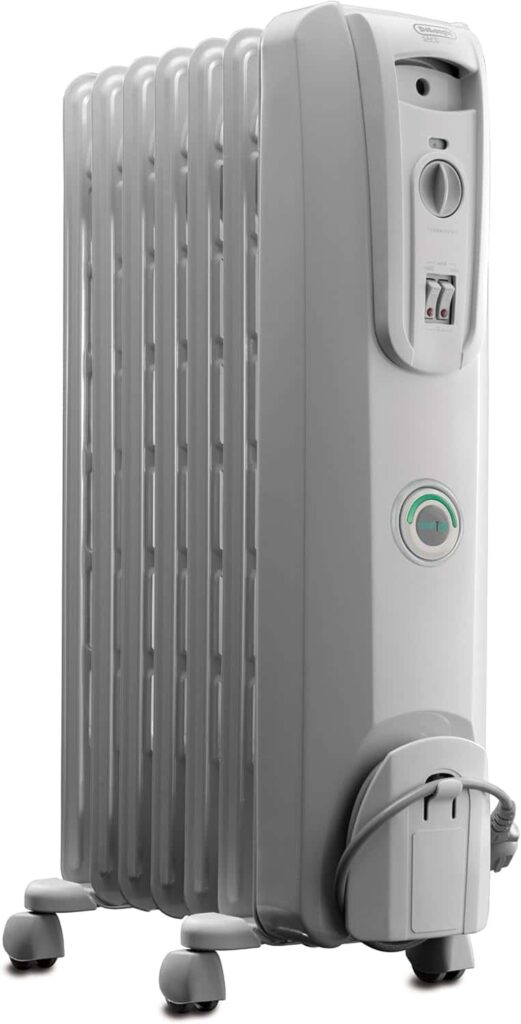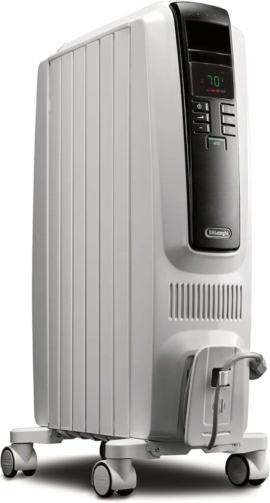 The De’Longhi Comfort Temp Full Room Radiant Heater provides smooth, gentle warmth without fan noise, making it ideal for bedrooms, living rooms, or study areas. Its oil-filled radiator fins deliver consistent heat retention, even after the unit powers down. Featuring Comfort Temp technology, the heater automatically adjusts power usage to maintain an optimal room temperature, reducing energy costs while preventing wasted output. The permanently sealed oil reservoir requires no refilling or maintenance, adding to long-term convenience. Multiple heat settings and an adjustable thermostat provide personalized comfort, while rounded edges keep children and pets safe from accidental contact. Built-in safety includes thermal shutoff and antifreeze mode to prevent freezing during colder climates. Smooth-glide caster wheels and a front carry handle allow easy mobility throughout the home. With reliable operation and whisper-quiet performance, this model is excellent for users who desire efficient whole-room heating without drying air or creating noisy distractions.