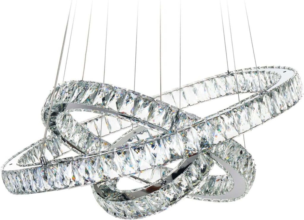 The MEEROSSE Modern Ceiling LED Fixture brings a sleek and futuristic style to contemporary interiors through its elegant trio of adjustable crystal rings. Designed with built-in energy-efficient LEDs, it provides up to 50,000 hours of illumination, making bulb replacements unnecessary while cutting long-term energy costs. Each ring is embellished with shimmering K9 crystals, dispersing light beautifully across dining rooms, bedrooms, foyers, and high-end office spaces. The chrome finish enhances its modern aesthetic, while height-adjustable cables allow creative hanging arrangements to suit various ceiling heights. Its high lumen output ensures well-balanced brightness, perfect for task lighting and ambient glow. Installation is simple thanks to clear instructions, and compatibility with dimmer switches gives users complete lighting control. Ideal for homeowners seeking a statement piece that offers practicality, durability, and modern luxury, this chandelier transforms any room into a polished, visually captivating environment full of sparkling light and contemporary sophistication.